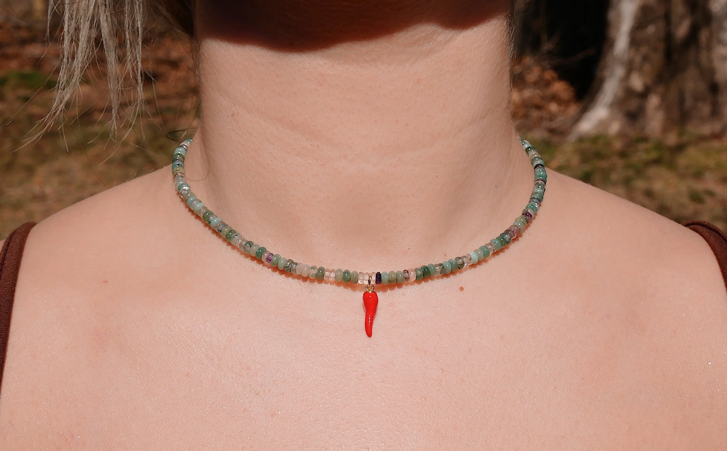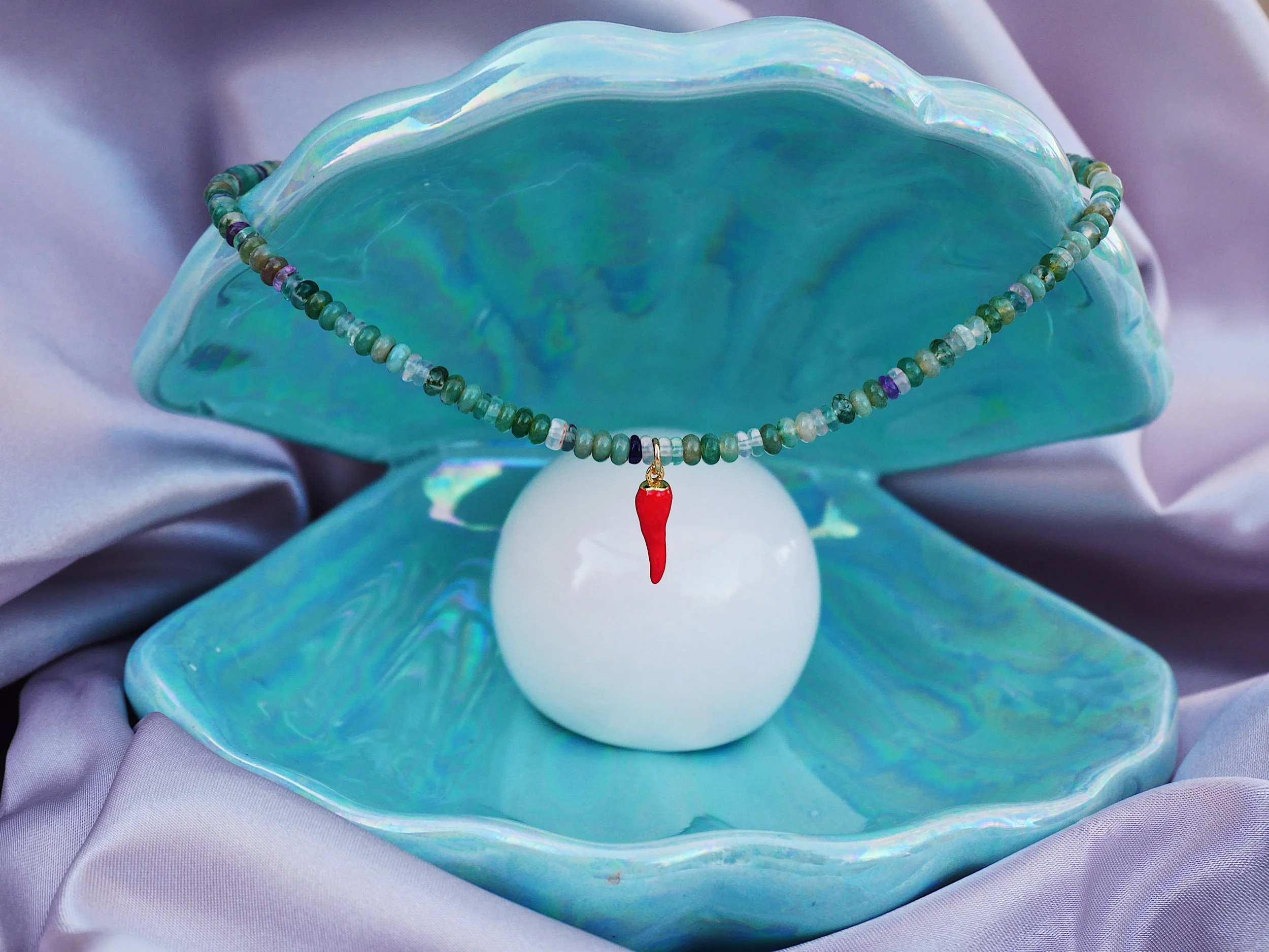 Natural moss agate and Fluorite beaded choker with 18k gold filled Serrano pepper. Comes with an adjustable gold filled clasp.