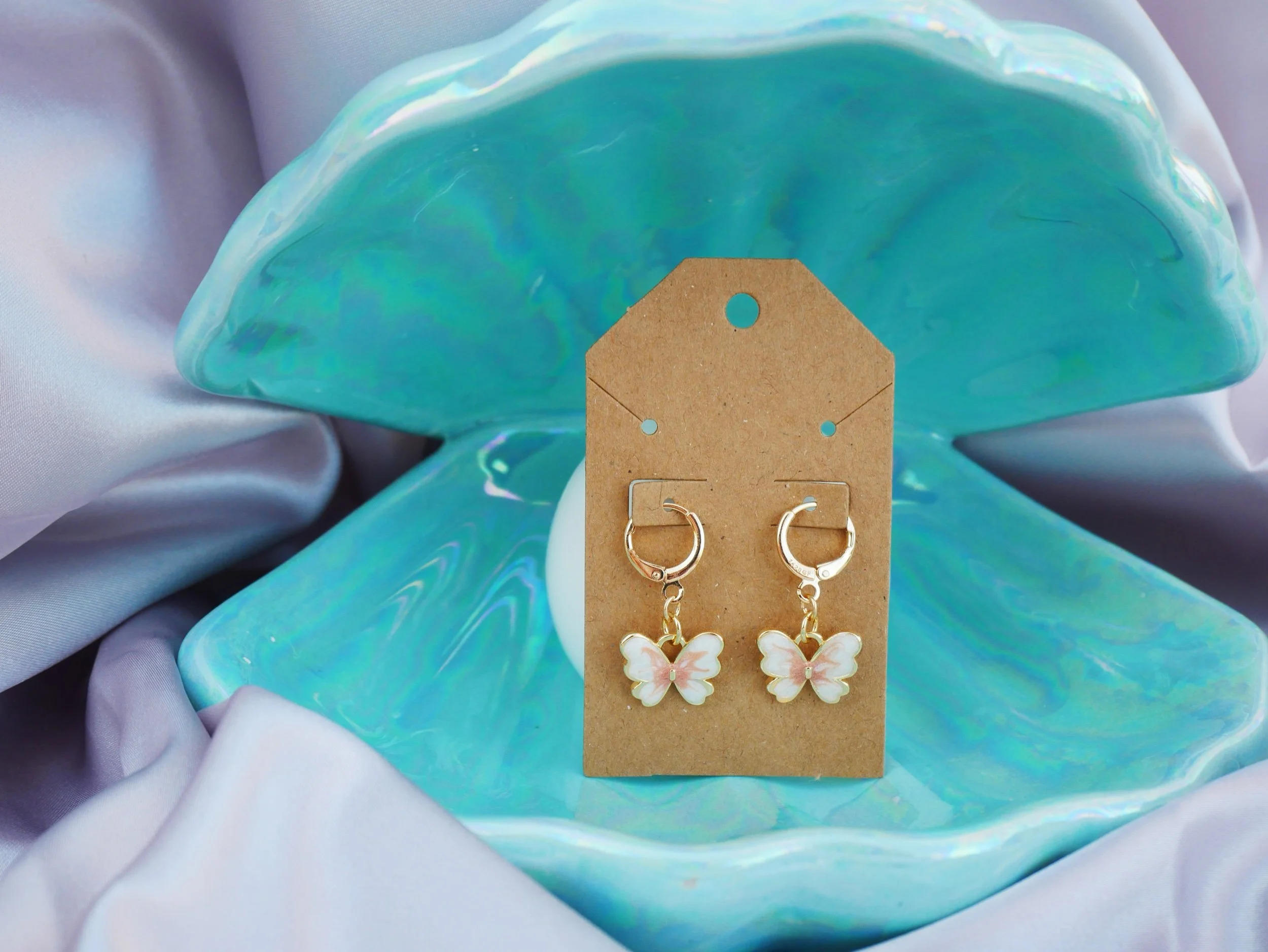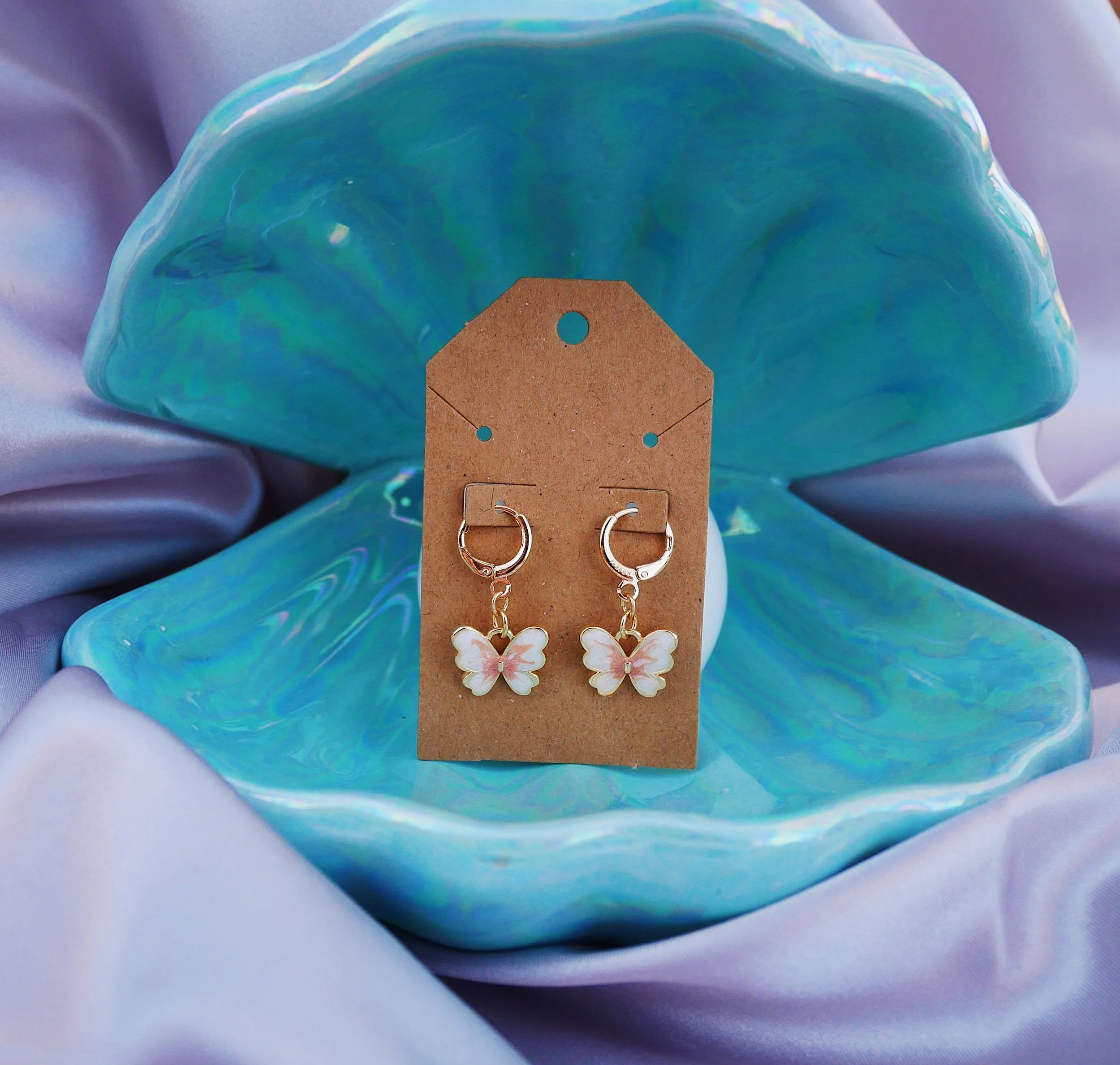 Shop › Butterfly Earrings Image 1 of 2 Image 2 of 2 Butterfly Earrings $18.00 Gold filled hoop earrings with gold filled butterfly charms Add To Cart Added! Gold filled hoop earrings with gold filled butterfly charms